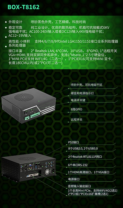 2個Realtek RTL8111F網(wǎng)口(10/100/1000M自適應(yīng)),6個串口RS-232 (RS485需加模塊),8個USB2.0, 2個USB3.0,方便ODM定制,保證客戶現(xiàn)場復(fù)雜的應(yīng)用需求;HDMI、VGA雙顯示接口,1路音頻輸入輸出;8路數(shù)字開關(guān)量GPIO(4*GPI,4*GPO,可自定義),1個遠程開關(guān),1*mSATA,1*SATA 2.5"SSD用于存儲;1個全高Mini PCIe,支持WIFI/4G(可二選一),2*PCI或1*PCIEx16擴展槽(二選一), 用于集成各種附加卡,例如I/O卡,運動控制卡、視覺卡和GPU卡(可支持長度180CM的獨立顯卡)。能滿足不同市場的多樣化需求,可廣泛應(yīng)用于工業(yè)制造、自動化檢測、工業(yè)視覺檢測、智能交通等領(lǐng)域。