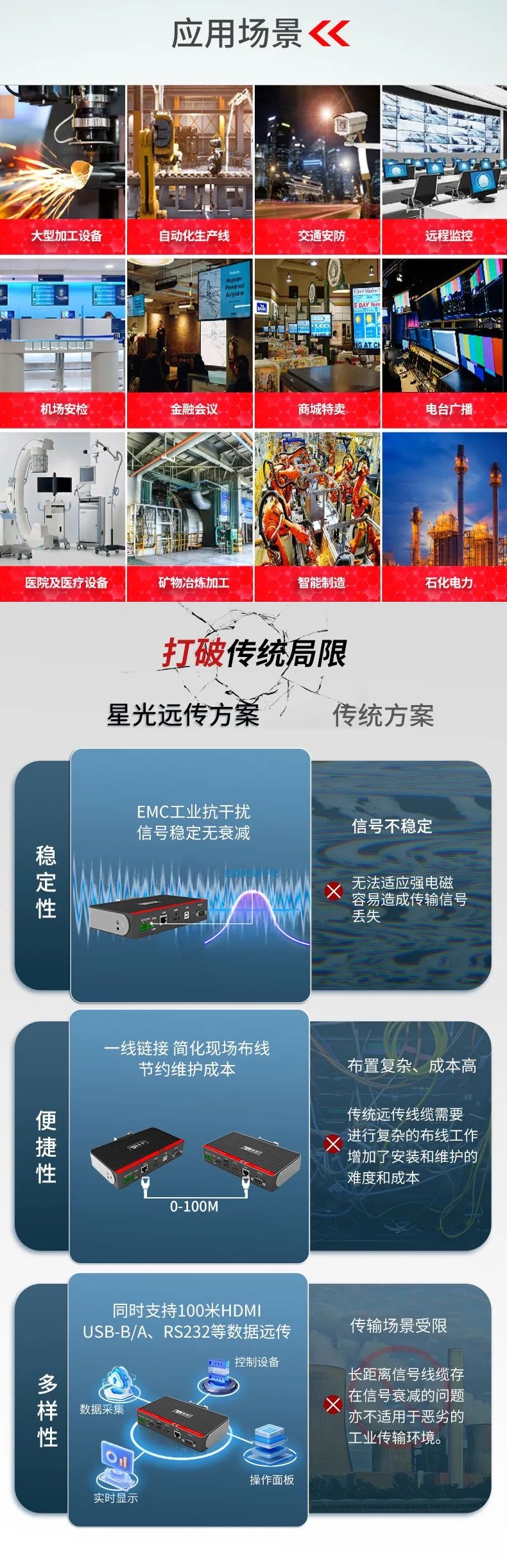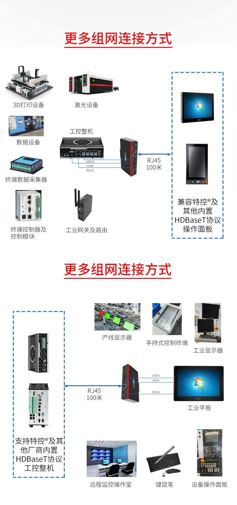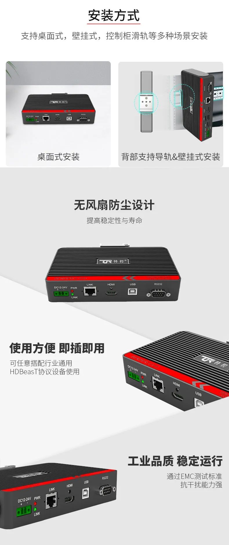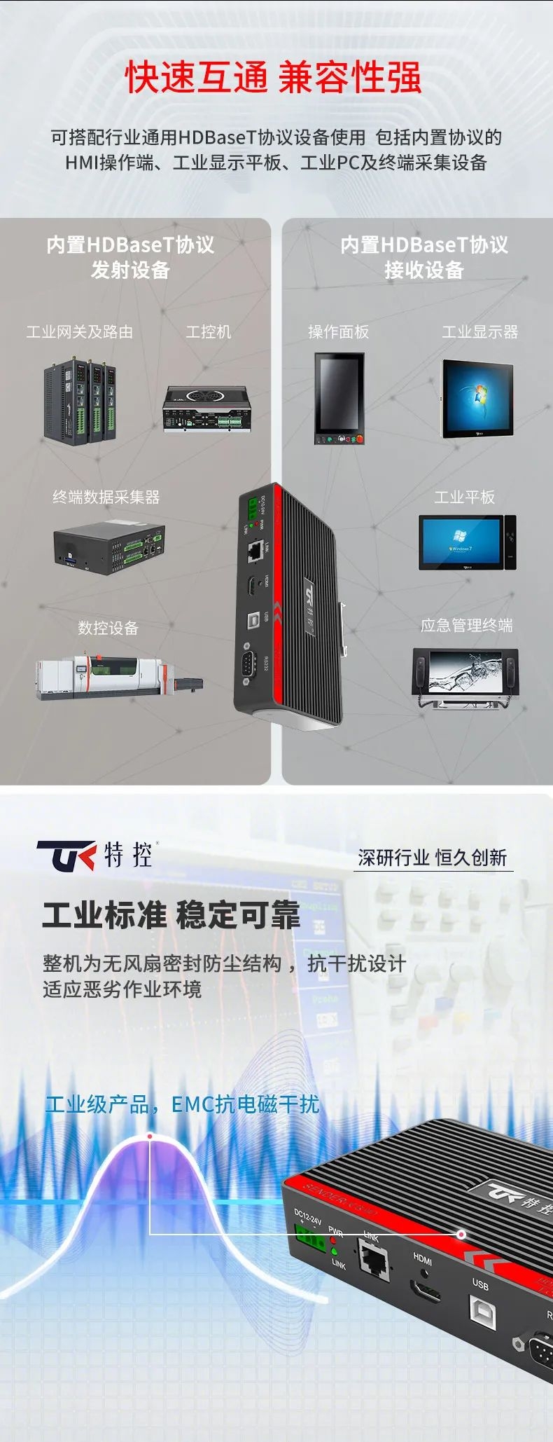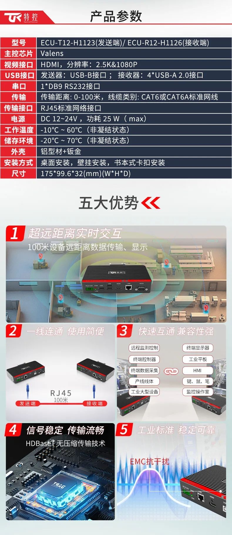 在大型裝備、自動化產(chǎn)線、激光及數(shù)控行業(yè)等需要遠(yuǎn)距離信號傳輸場景中,傳統(tǒng)HDMI線纜存在信號衰減、傳輸距離限制、布線不便等問題,這極大地影響顯示端的成像質(zhì)量和雙向數(shù)據(jù)的穩(wěn)定性和時效性。為此,特控研發(fā)出抗干擾性強(qiáng)、數(shù)據(jù)零延時、兼容性強(qiáng)的HDMI星光遠(yuǎn)傳ECU-TR12。特控ECU-TR12采用進(jìn)口高性能芯片設(shè)計(jì),總體由發(fā)射端T12和接收端R12兩部分組成,發(fā)射端可將2.5k高清視頻信號、USB和RS232數(shù)據(jù)信號進(jìn)行整合,通過標(biāo)準(zhǔn)網(wǎng)線(CAT6)遠(yuǎn)距離傳輸?shù)浇邮斩?,無信號衰減,接收端通過高性能智能芯片解碼,可以給用戶高速高質(zhì)量的數(shù)據(jù)及顯示交互體驗(yàn),整機(jī)外殼采用鋁合金散熱設(shè)計(jì),機(jī)身堅(jiān)固小巧獨(dú)具工業(yè)美感,可搭配行業(yè)通用HDBeasT協(xié)議設(shè)備使用,包括內(nèi)置協(xié)議的HMI操作端、工業(yè)顯示平板、工業(yè)PC及終端采集設(shè)備。