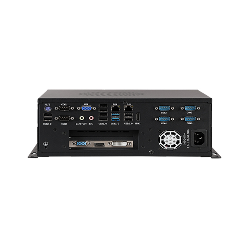 外觀設(shè)計(jì) : 噴砂黑色外殼,工藝精細(xì),科技時(shí)尚高性能 : 支持4/6/7/8/9代Intel LGA1150/1151接口全系列處理器穩(wěn)定可靠 : 純工業(yè)設(shè)計(jì),優(yōu)良的散熱結(jié)構(gòu),機(jī)箱內(nèi)置1*6015高速散熱風(fēng)扇,機(jī)箱可抗接觸式6KV強(qiáng)電磁干擾;AC100-240V輸入或者DC12V輸入(默認(rèn)AC100-240V輸入)接口豐富 : 2* Realtek LAN, 6*COM,10*USB, 8*GPIO, 1*遠(yuǎn)程開(kāi)關(guān),VGA+HDMI,支持同步和異步,支持1*Msata ,1*2.5寸硬盤(pán)位,1*MINI PCIE支持 WIFI/4G(二選一),1*PCIEX16(可支持MINI 顯卡,長(zhǎng)度180CM以內(nèi))或2*PCI(可二選一)